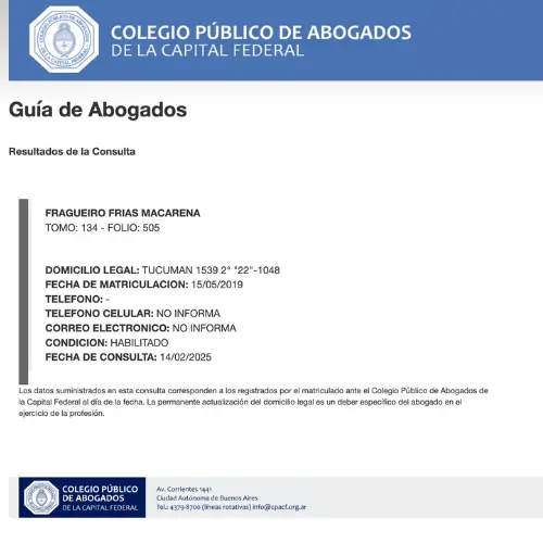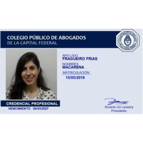 La Abogada Fragueiro Frias estudió en la Universidad de Buenos Aires, cuenta con muchos años de ejercicio independiente de la profesión.